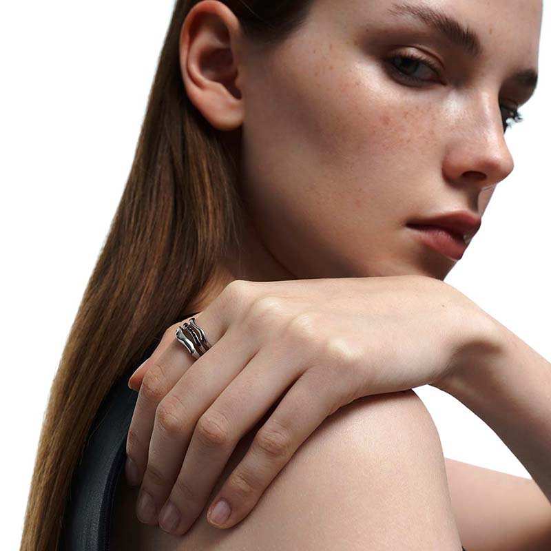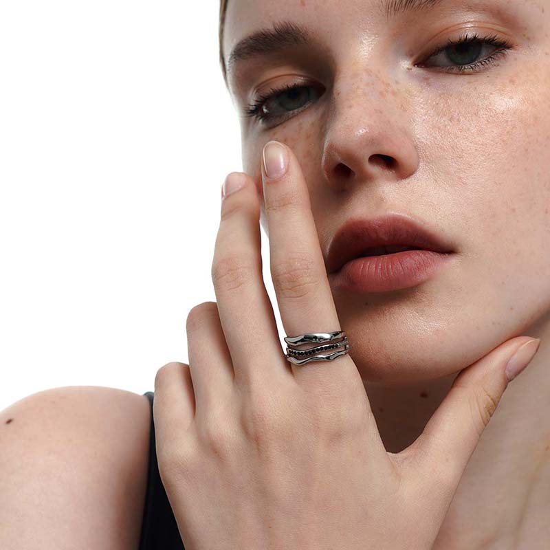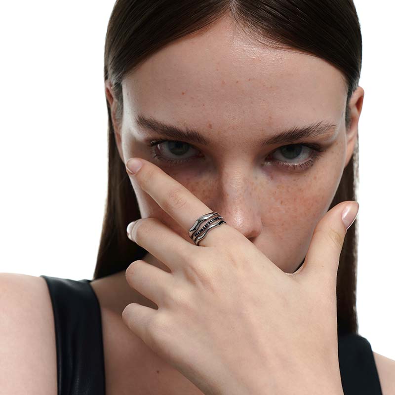 Description: Designed with a flame-inspired motif, this ring features three layers of varying thickness. The center is set with a black cubic zirconia, flanked by sides detailed with chain-like patterns, adding to the intricacy and richness of the design.
