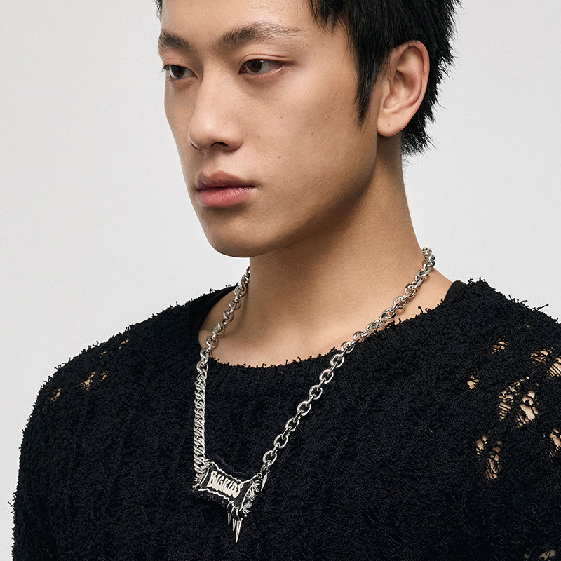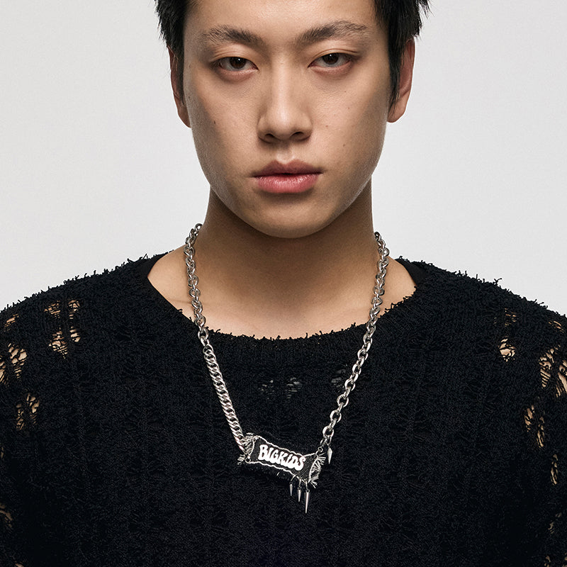 Creative denim label necklace with metallic graffiti letters to enhance the punk vibe. The adjustable length allows for different wearing effects.