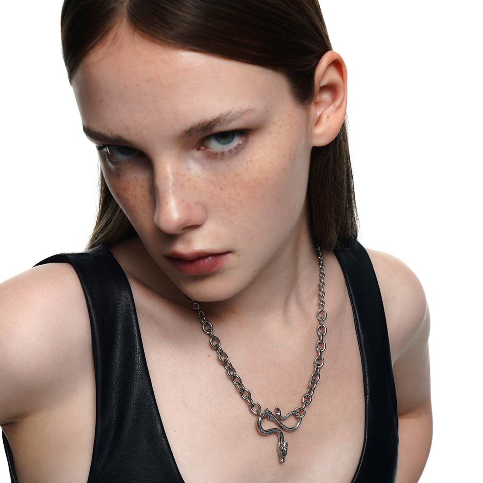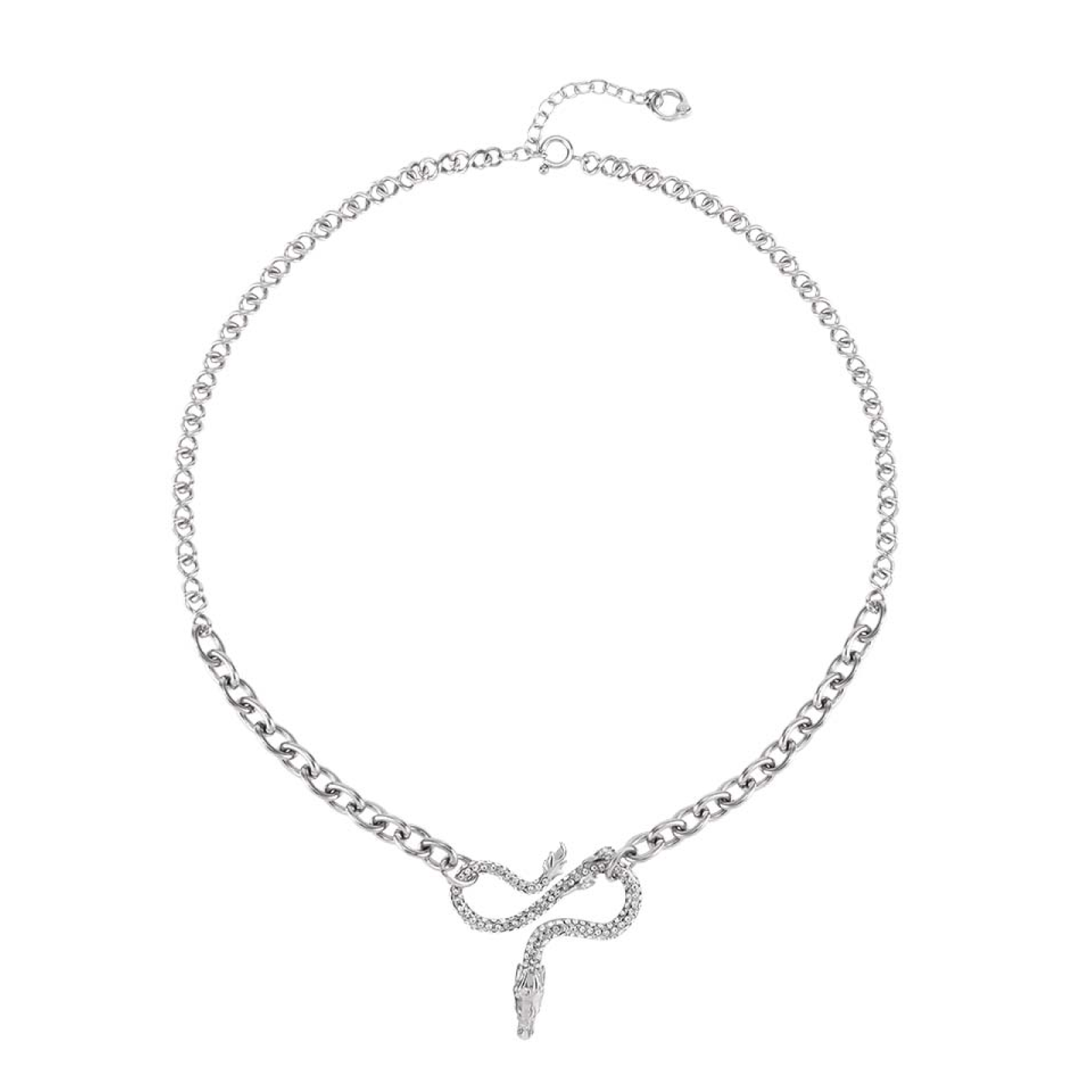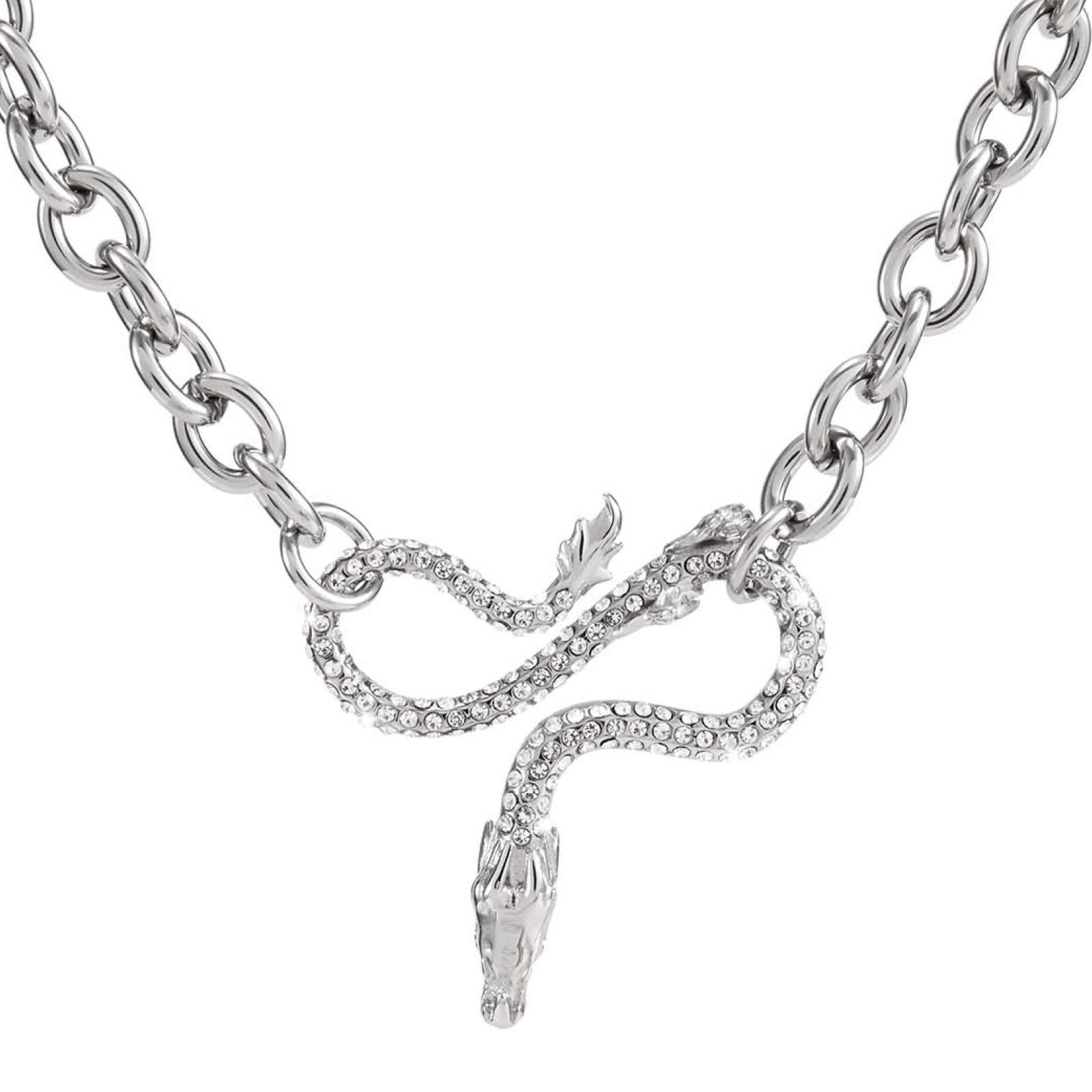 Description: This necklace features a dragon as the main design, with a front detailed with a chain pattern and the reverse side adorned with cubic zirconia, allowing it to be worn both ways. The combination of two different chain styles enhances the overall design aesthetic.