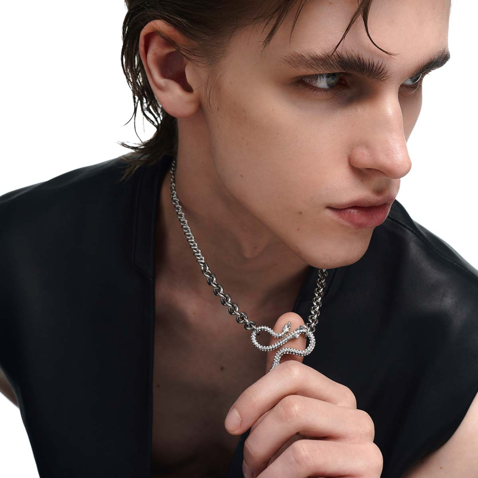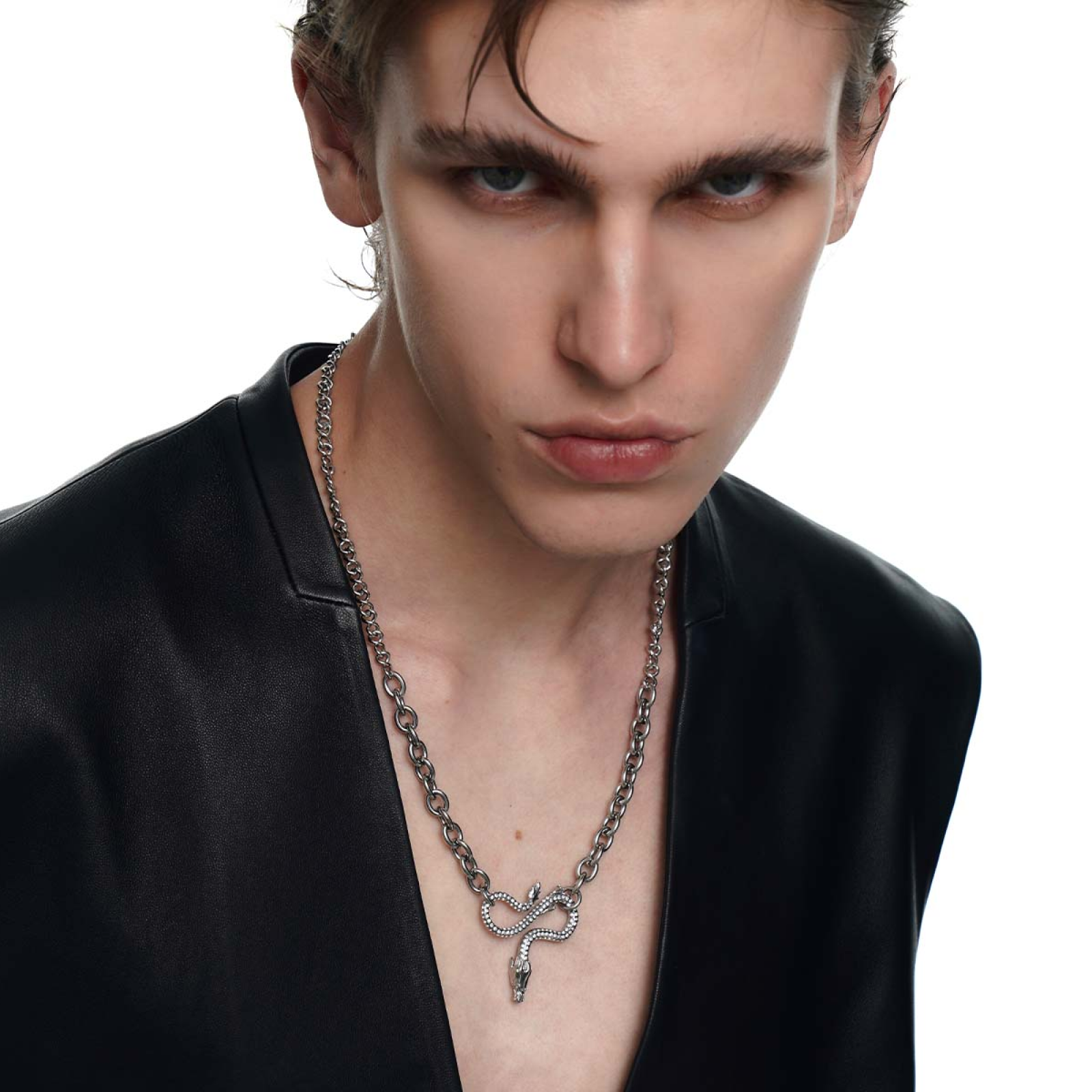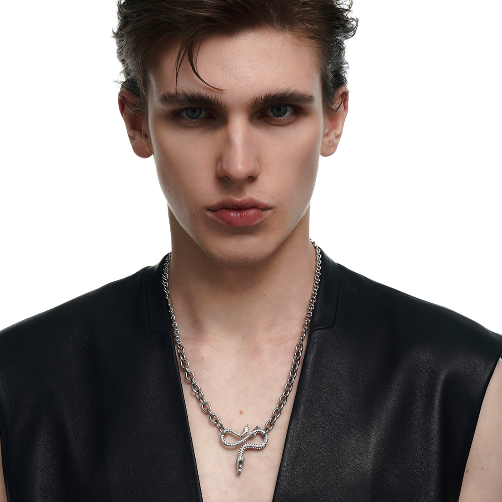 Description: This necklace features a dragon as the main design, with a front detailed with a chain pattern and the reverse side adorned with cubic zirconia, allowing it to be worn both ways. The combination of two different chain styles enhances the overall design aesthetic.