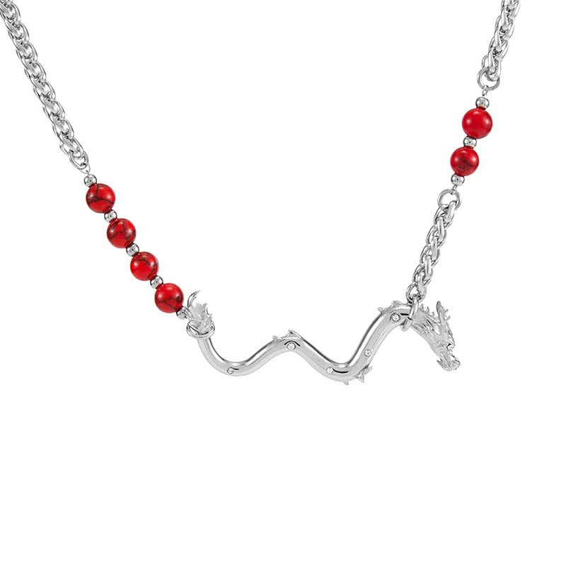 Description: Featuring a dragon as the main form, the body of the dragon is adorned with black and transparent cubic zirconia, enhancing its detailed appearance. The dragonbone chain is interspersed with imperial jasper, enriching the design of the necklace.