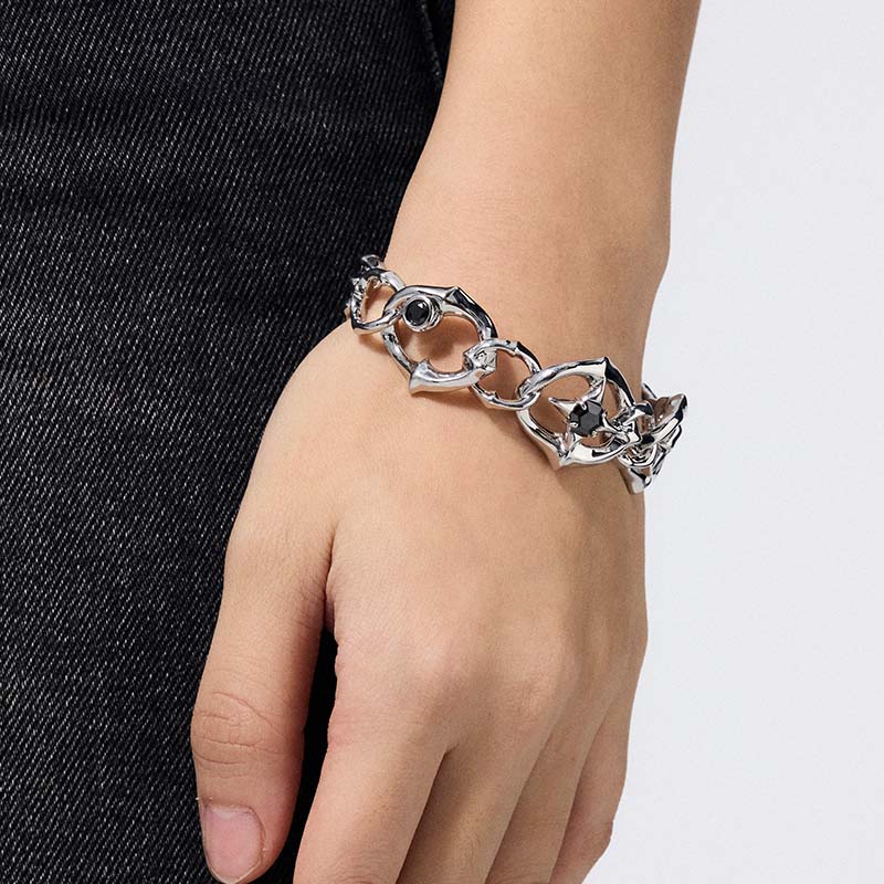 A uniquely structured bracelet formed by star-shaped chains connected through varying chain sizes. Flowing, elegant lines are accented with high-quality zircon stones, creating a mysterious yet refined overall impression.