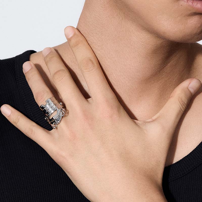 A double-layer movable armor ring featuring streamlined detailing and a kite-cut black zircon. The articulated layers allow flexible movement, creating a refined yet dynamic design.