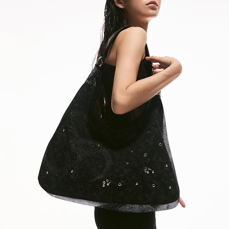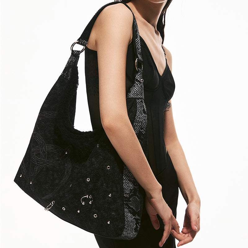 Black-silver snake print leather spliced with black denim and raw-edge finish. Detailed with embroidered triple serpent logo, studs, piercing rings, and rivets. A spacious punk-style tote bag.