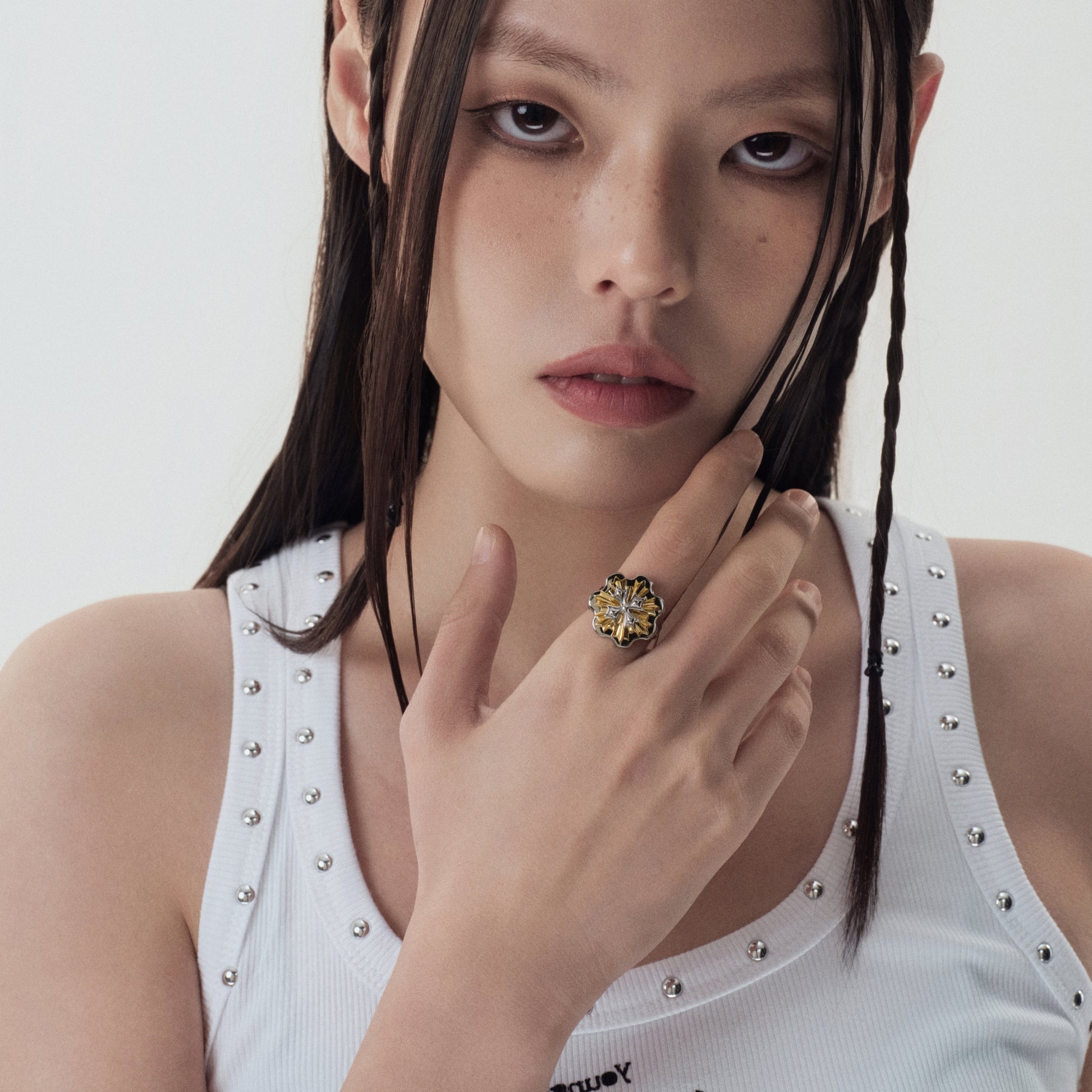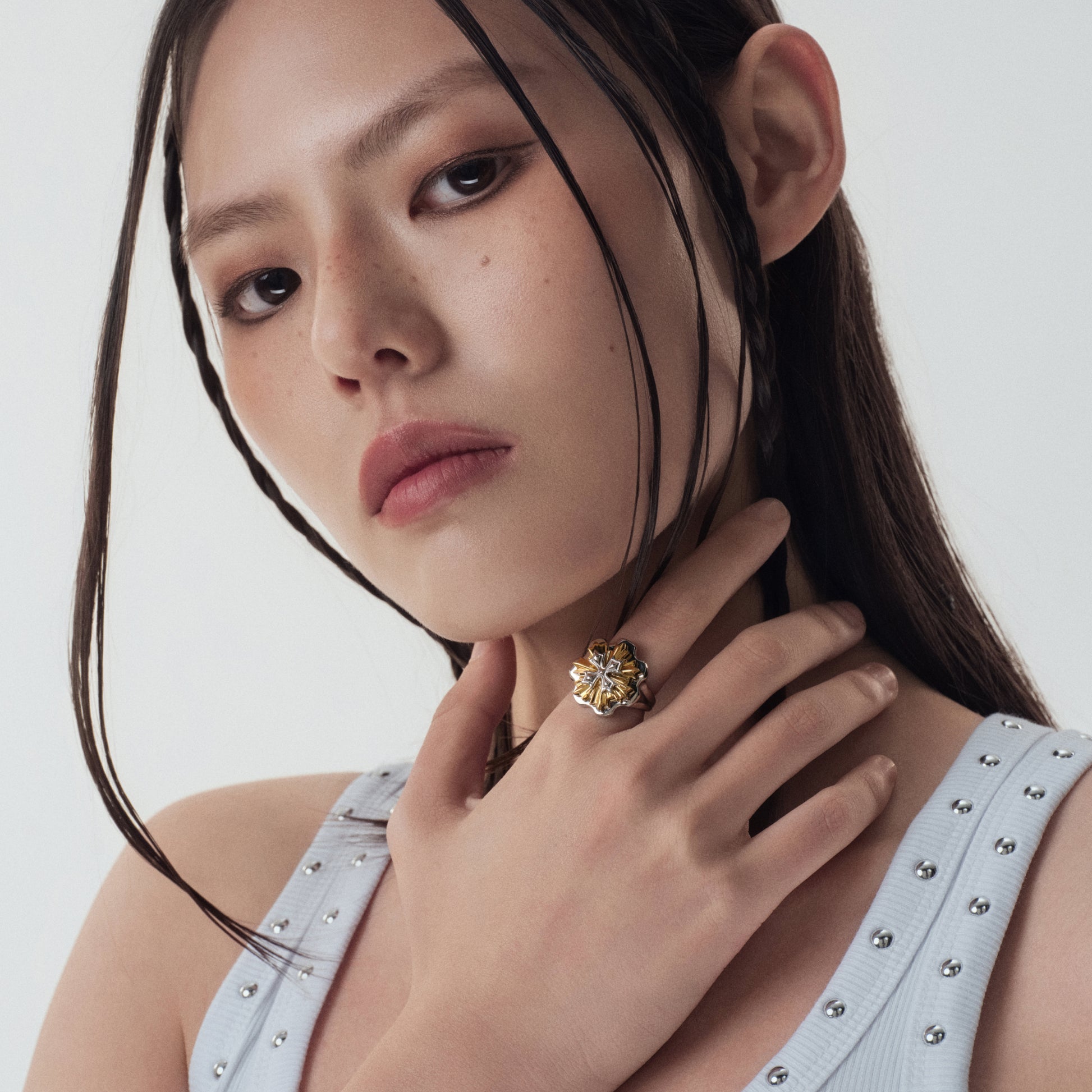 Cornflower medal ring with reflective petal detailing. Two-tone finish. Rotatable floral centerpiece for playful interaction.