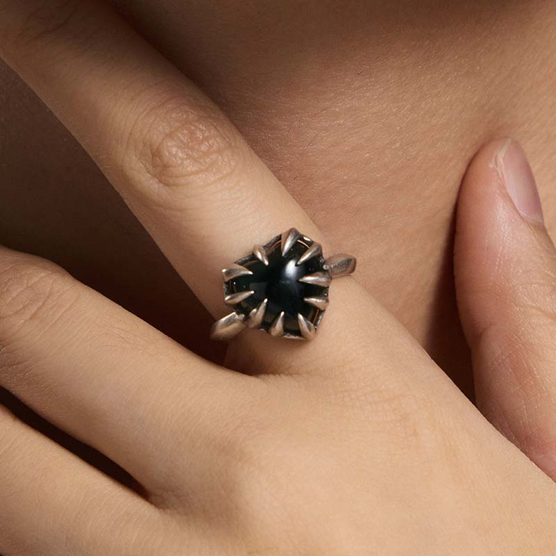 Simplified claw design encasing a heart-shaped black onyx, symbolizing a punk heart—sharp, resilient, and full of character.