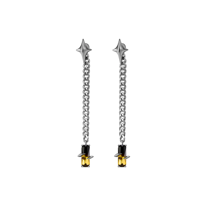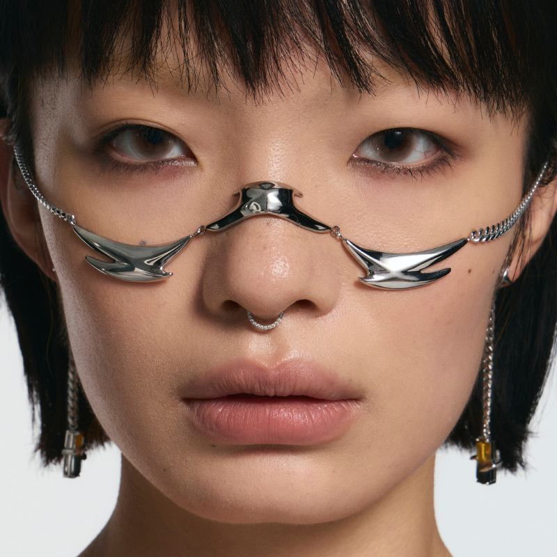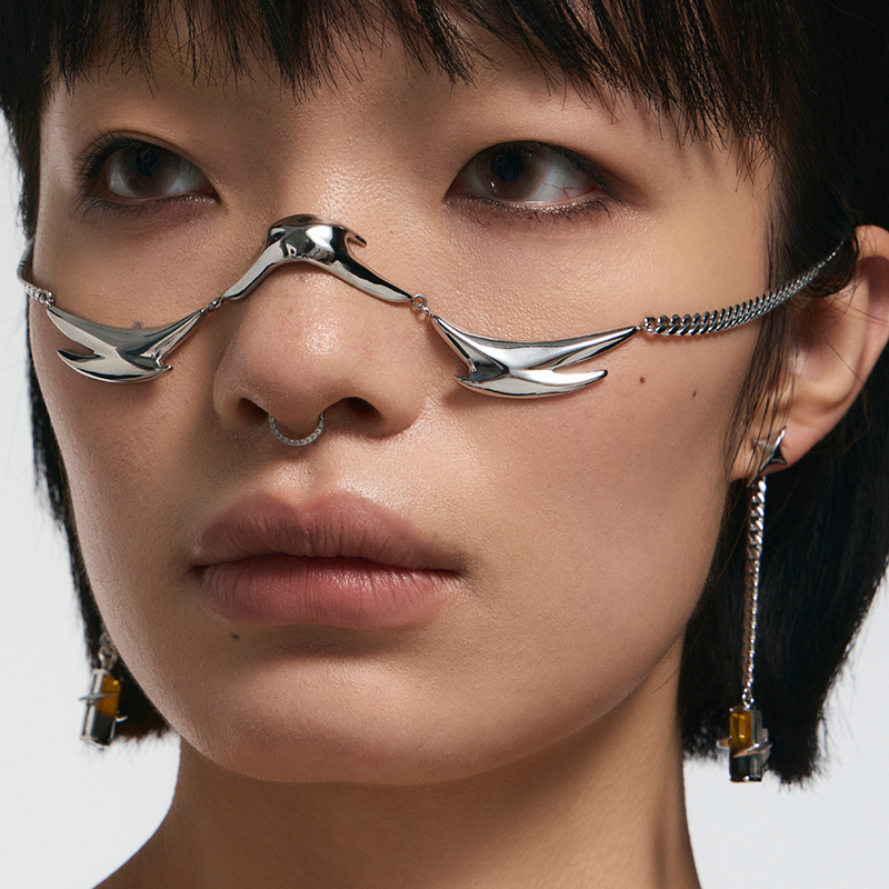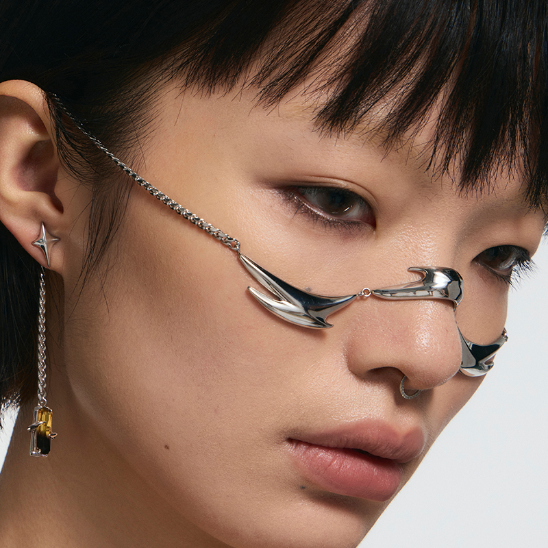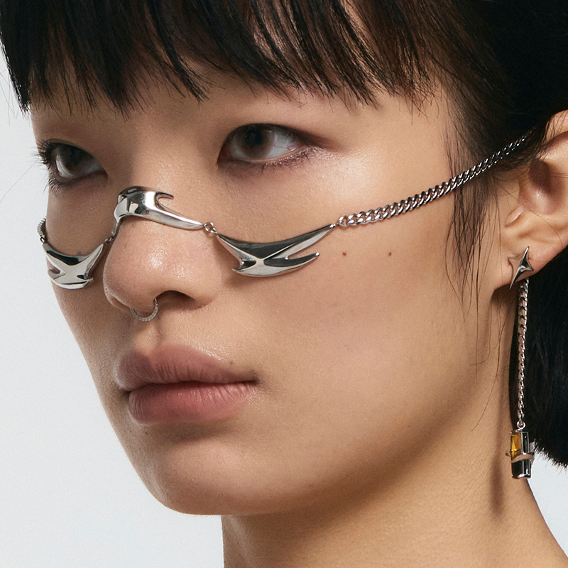 Spiked element face ornament design, unique style, strong visual presence, earrings detachable for everyday wear.