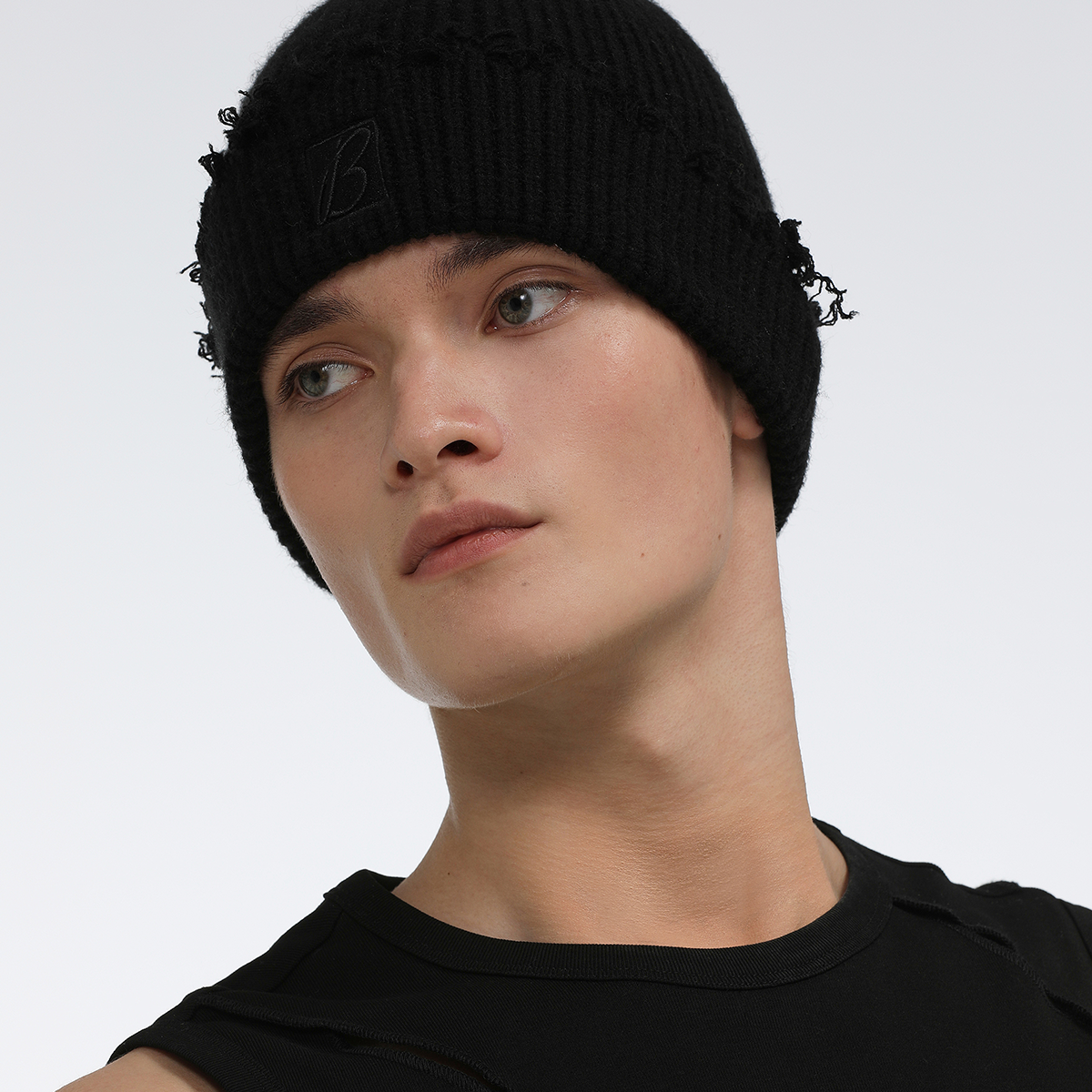 Details: There is a black and white embroidered icon of a desperate hand holding a rose on the front, and the edge of the hat has a frayed edge design.