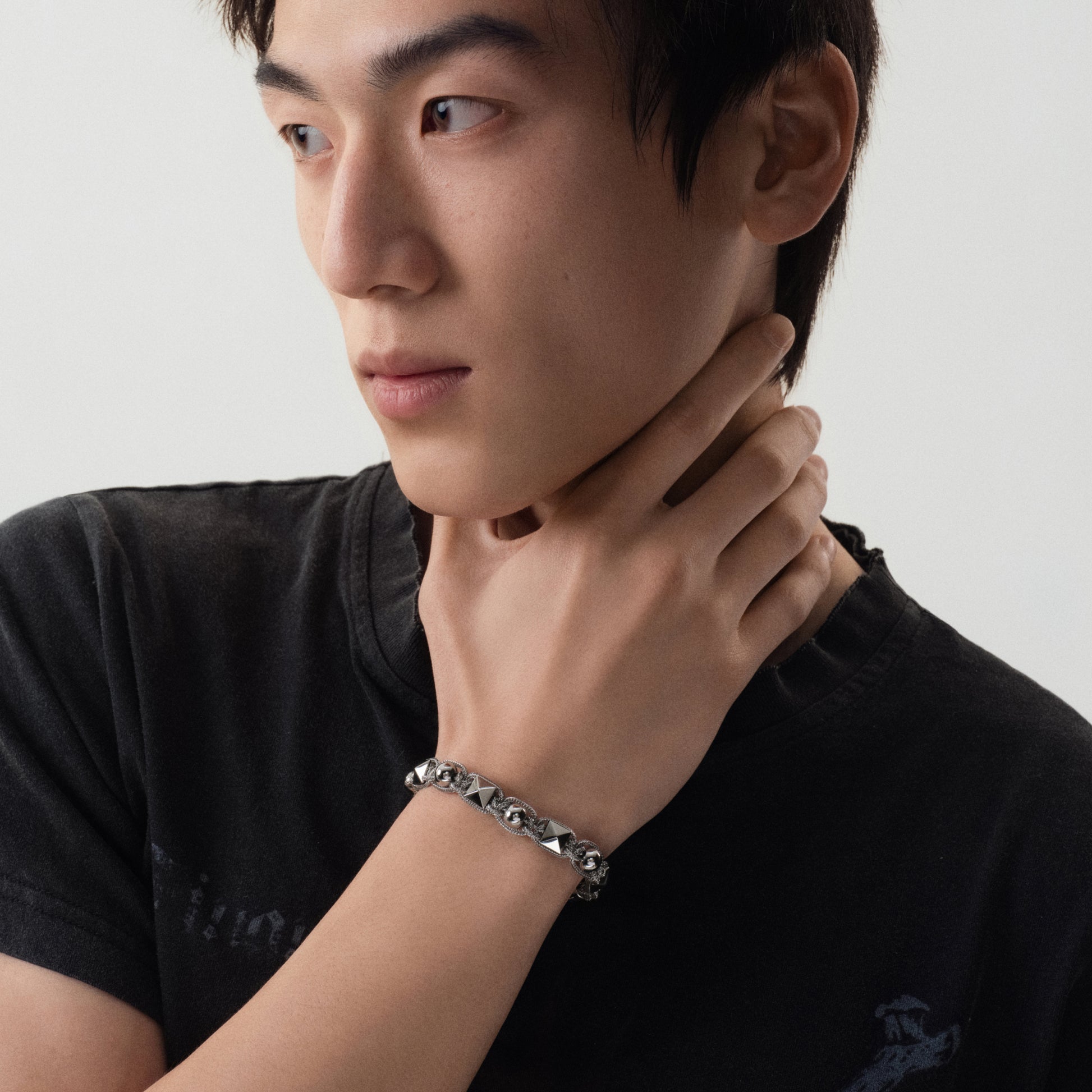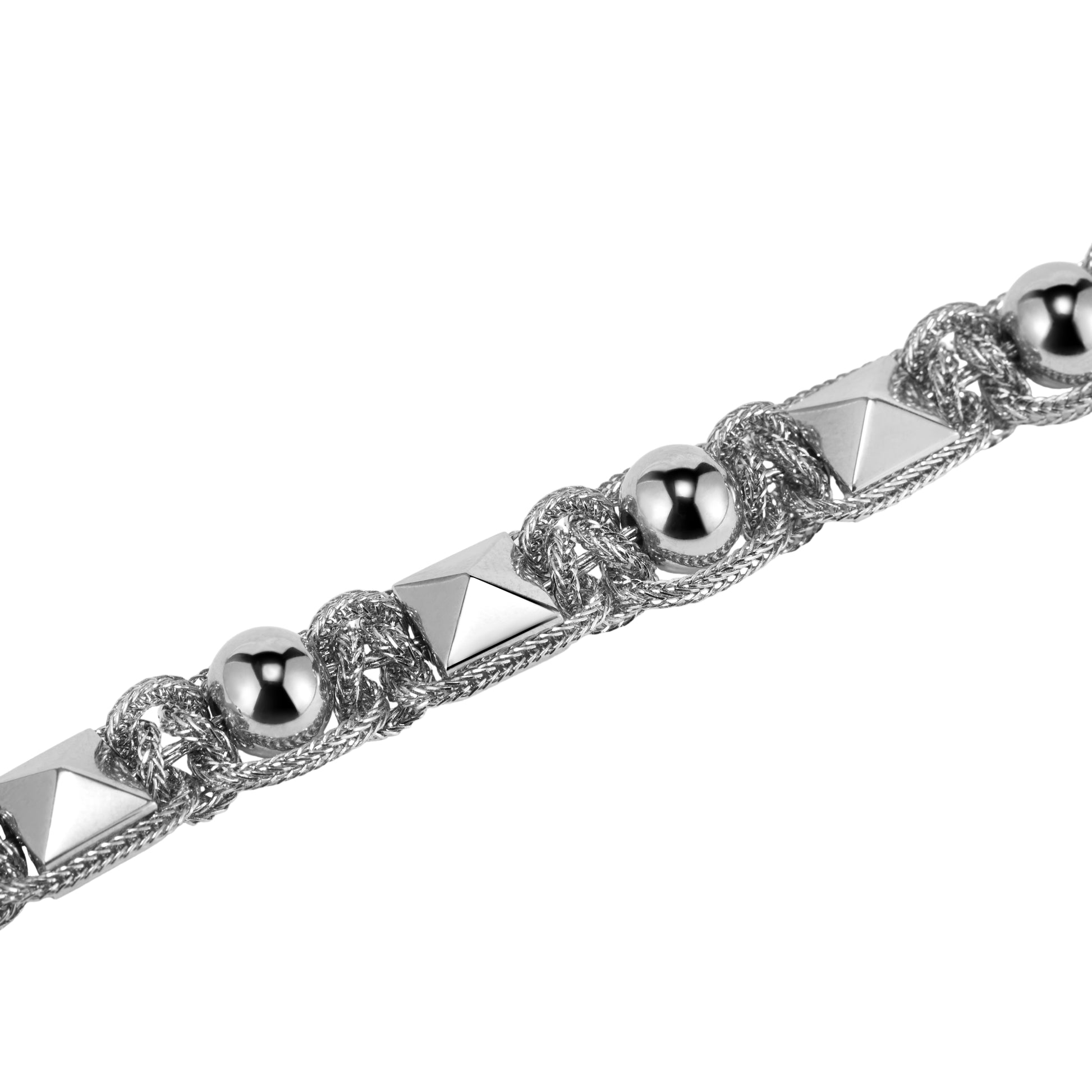 Studded woven bracelet combining square studs, metal beads, and chain elements. Subtle punk edge with everyday versatility.