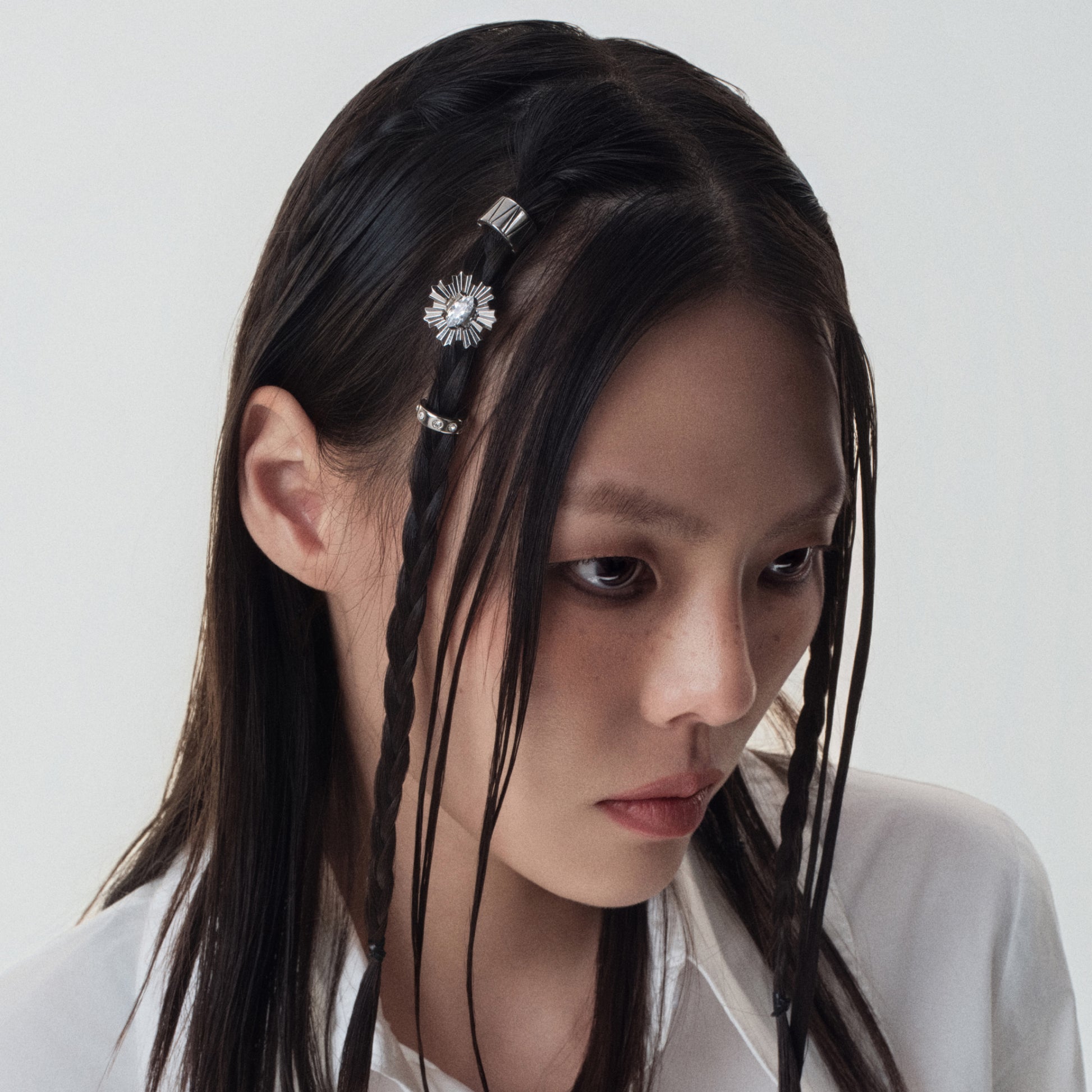 Cornflower hair pins designed for braids or clustered styling. Teardrop CZ and engraved metal details shimmer through the hair.