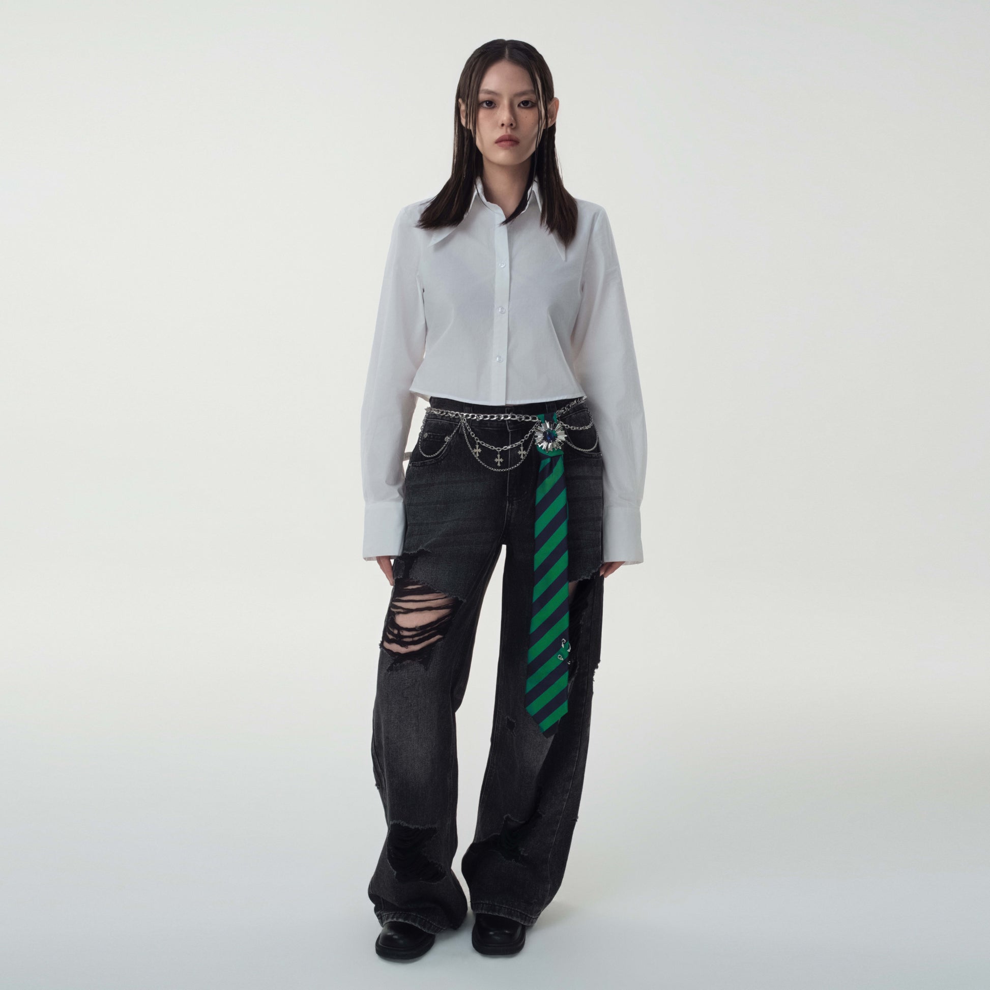 Punk academia tie with layered metal chains and studded detailing. Detachable components allow multiple styling options. Cornflower medal with blue-green stone can be worn separately as a brooch.